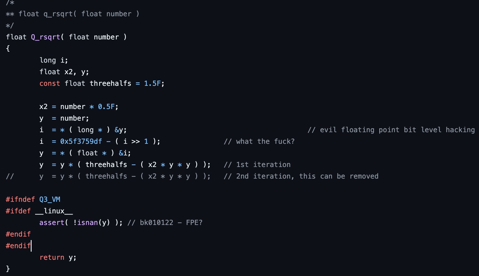 著名的雷神之锤代码 Q_rsqrt https://github.com/id-Software/Quake-III-Arena/blob/master/code/game/q_math.c